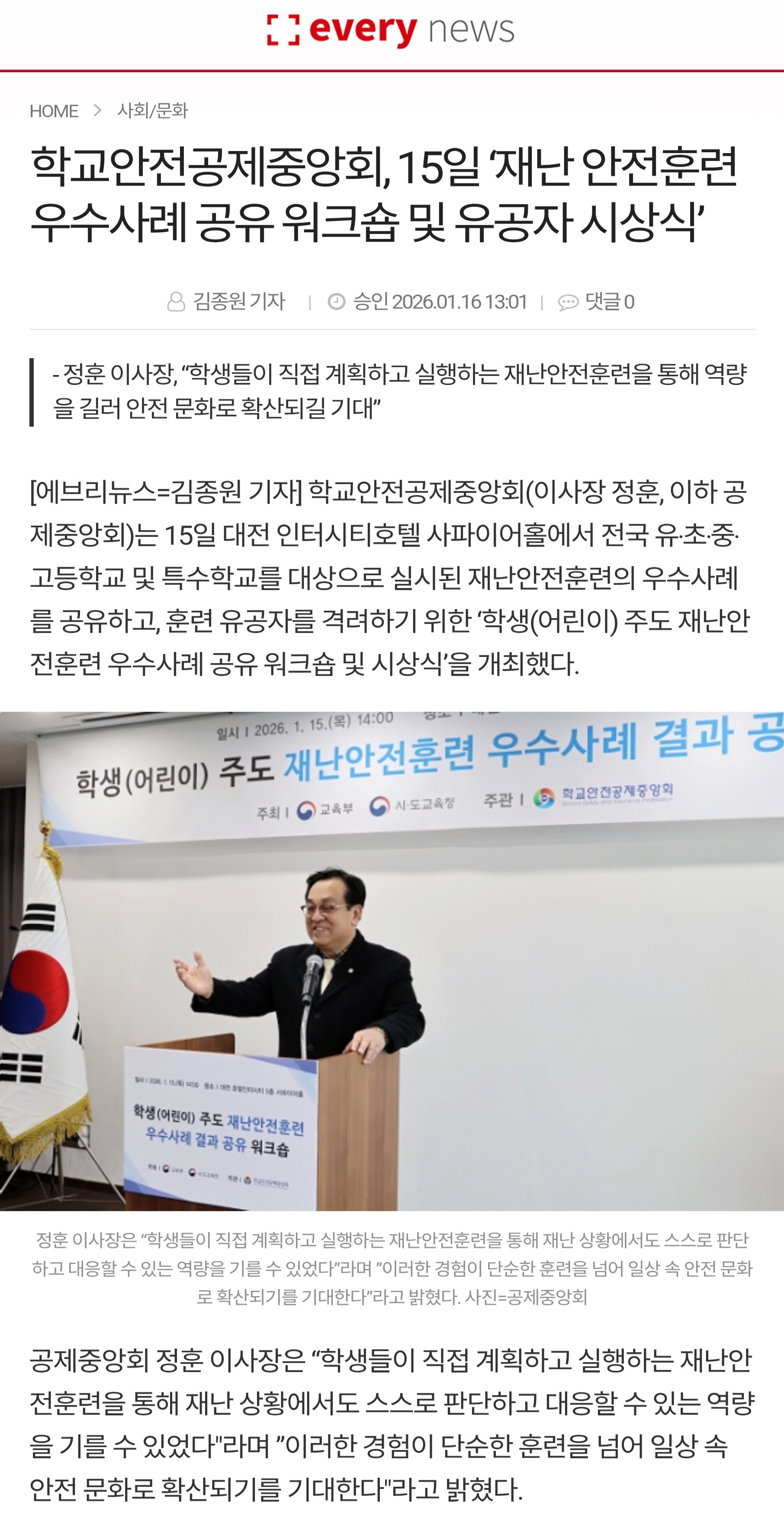 □ [에브리뉴스] (2026.1.16.) 학교안전공제중앙회, 15일 ‘재난 안전훈련 우수사례 공유 워크숍 및 유공자 시상식’ http://www.everynews.co.kr/news/articleView.html?idxno=47502
