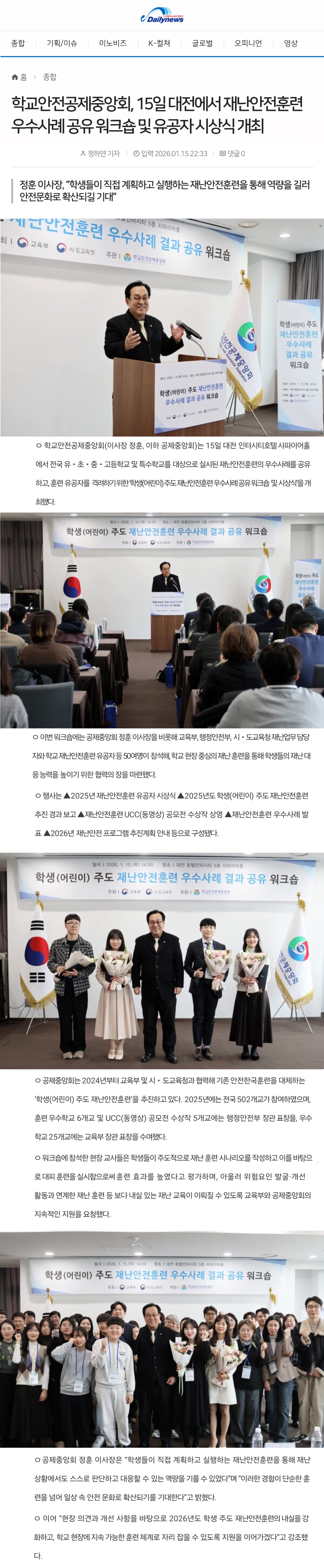□ [데일리뉴스] (2026.1.15.) 학교안전공제중앙회, 15일 대전에서 재난안전훈련 우수사례 공유 워크숍 및 유공자 시상식 개최 https://www.idailynews.co.kr/news/articleView.html?idxno=106157