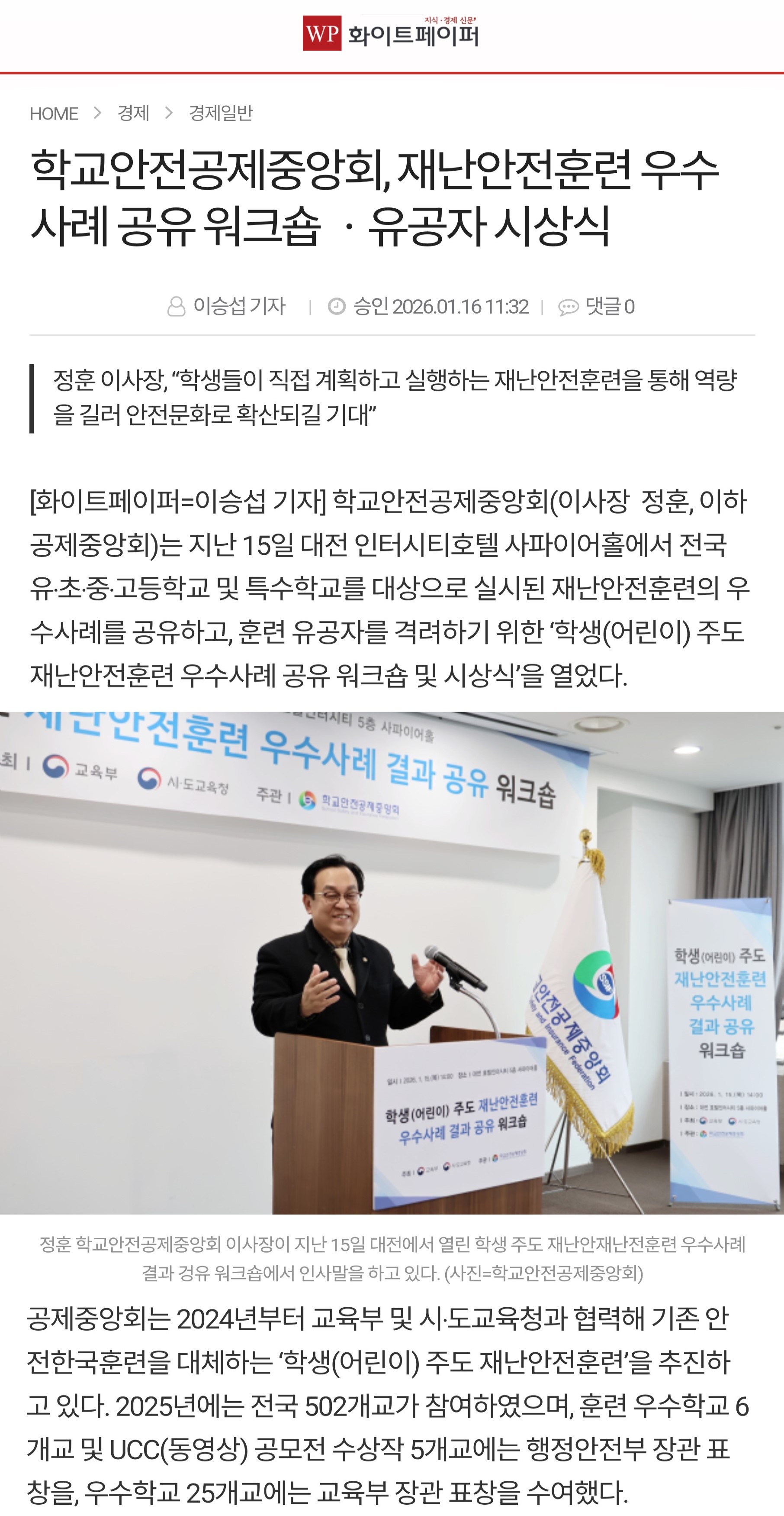 □ [화이트페이퍼] (2026.1.16.) 학교안전공제중앙회, 재난안전훈련 우수사례 공유 워크숍 ㆍ유공자 시상식 https://www.whitepaper.co.kr/news/articleView.html?idxno=257031