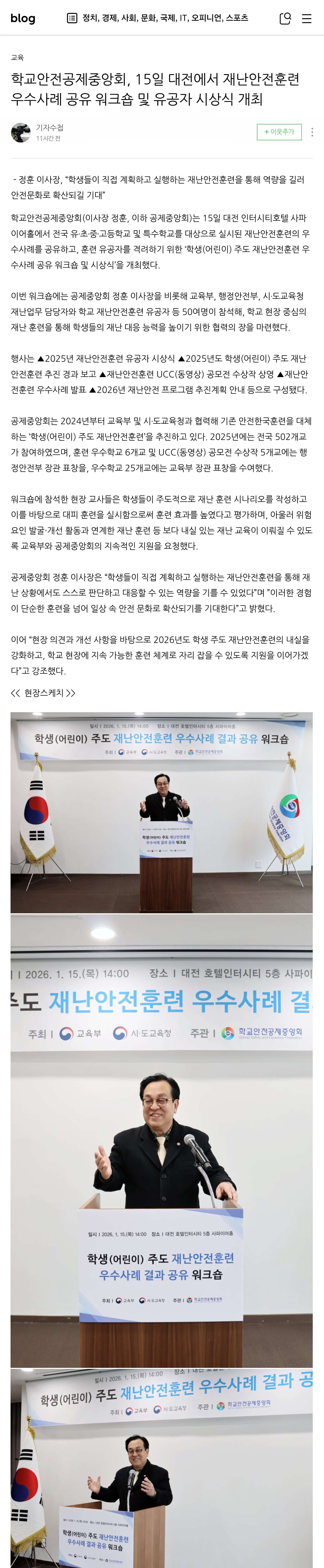 □ [기자수첩] (2026.1.18.) 학교안전공제중앙회, 15일 대전에서 재난안전훈련 우수사례 공유 워크숍 및 유공자 시상식 개최 https://blog.naver.com/enhanok70/224151233474