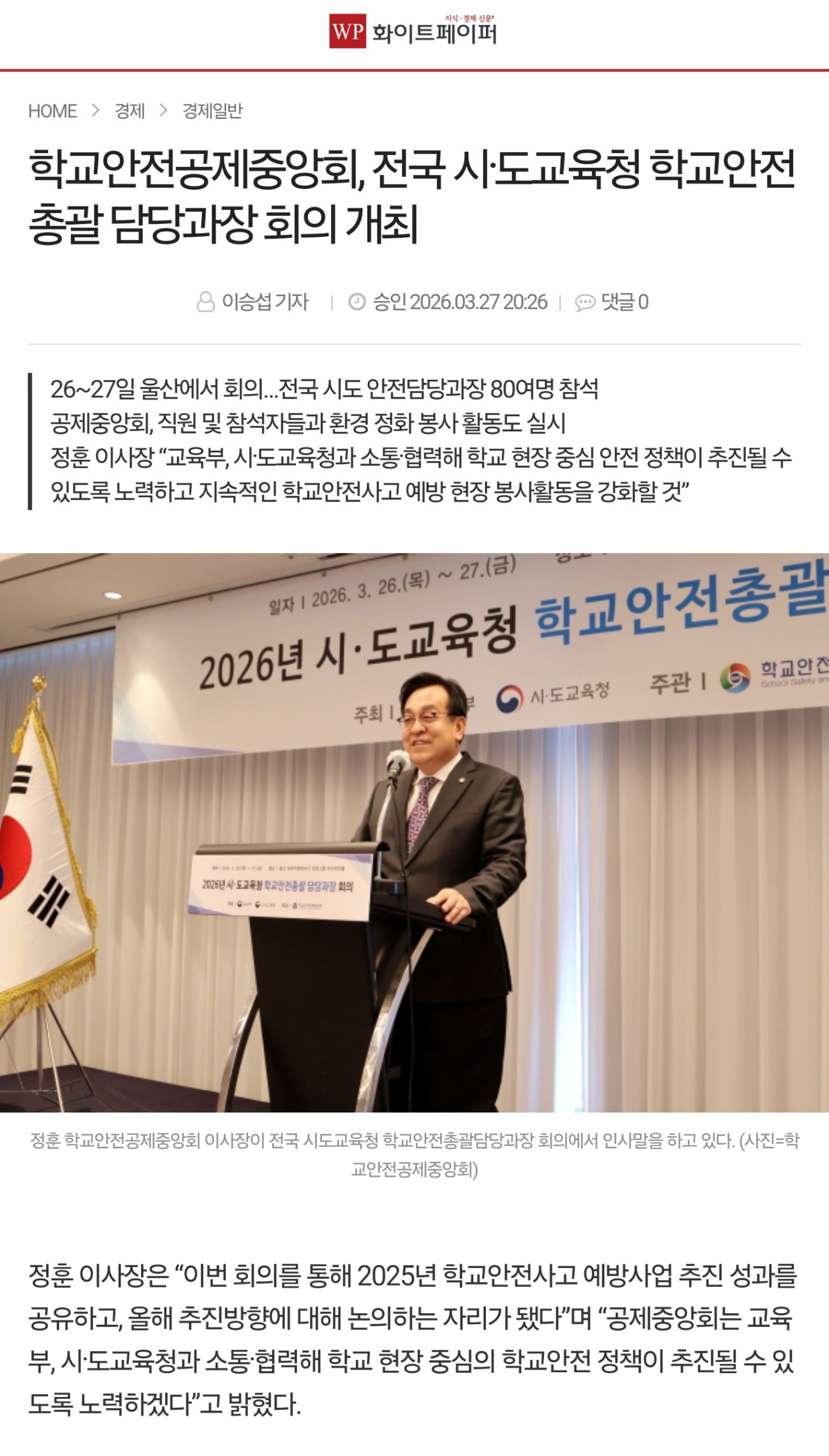 □ [화이트페이퍼] (2026.03.27.) 학교안전공제중앙회, 전국 시⸱도교육청 학교안전총괄 담당과장 회의 개최 https://www.whitepaper.co.kr/news/articleView.html?idxno=260210