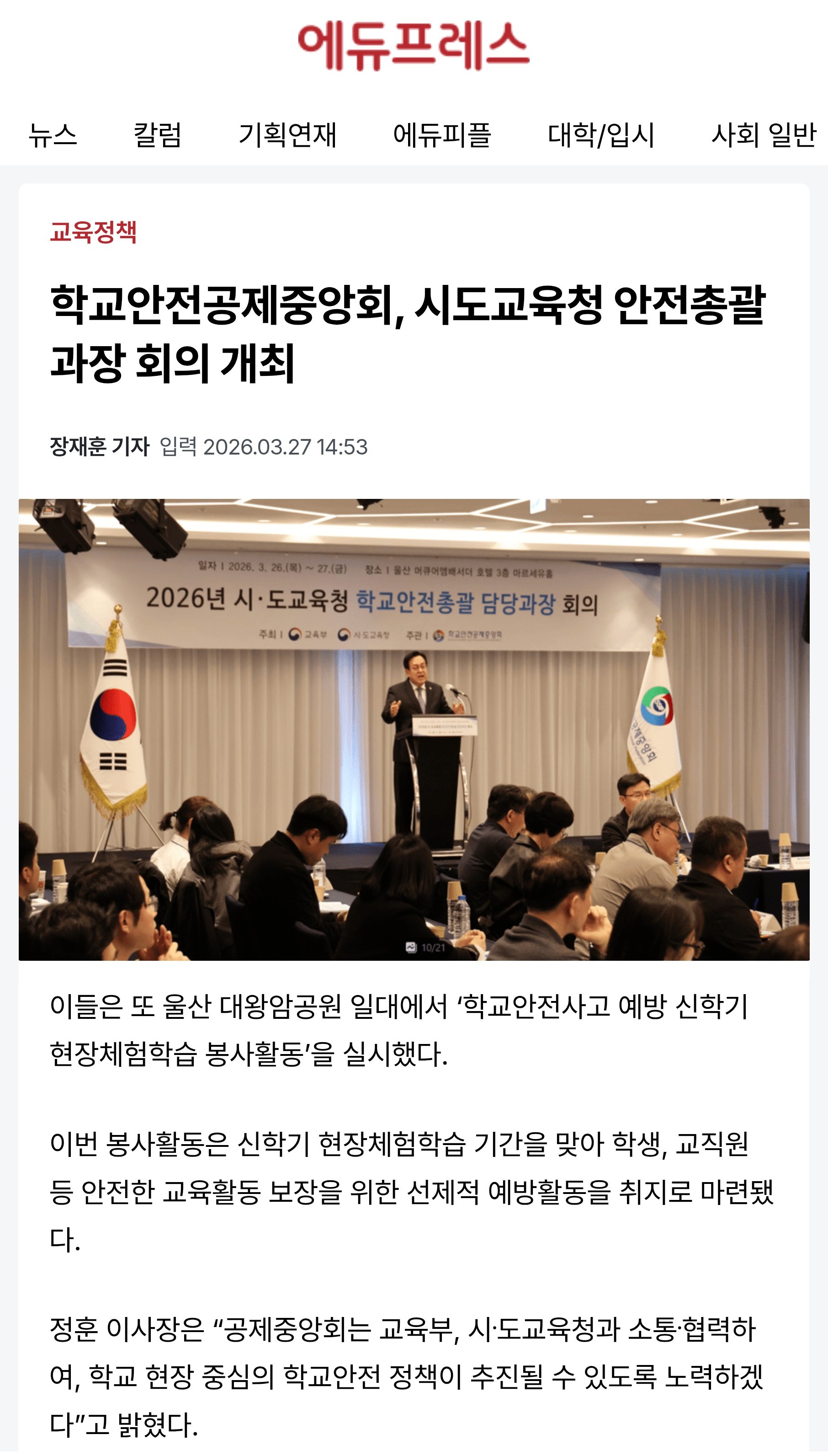 □ [에듀프레스] (2026.03.27.) 학교안전공제중앙회, 시도교육청 안전총괄과장 회의 개최 https://www.edupress.kr/news/articleView.html?idxno=30064