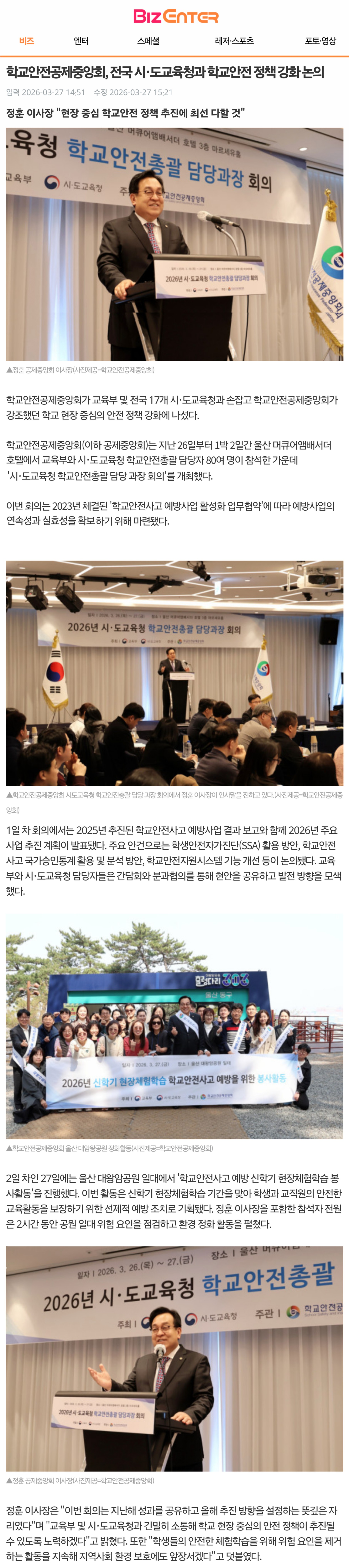 □ [비즈엔터] (2026.03.27.) 학교안전공제중앙회, 전국 시⸱도교육청과 학교안전 정책 강화 논의 https://enter.etoday.co.kr/news/view/295301