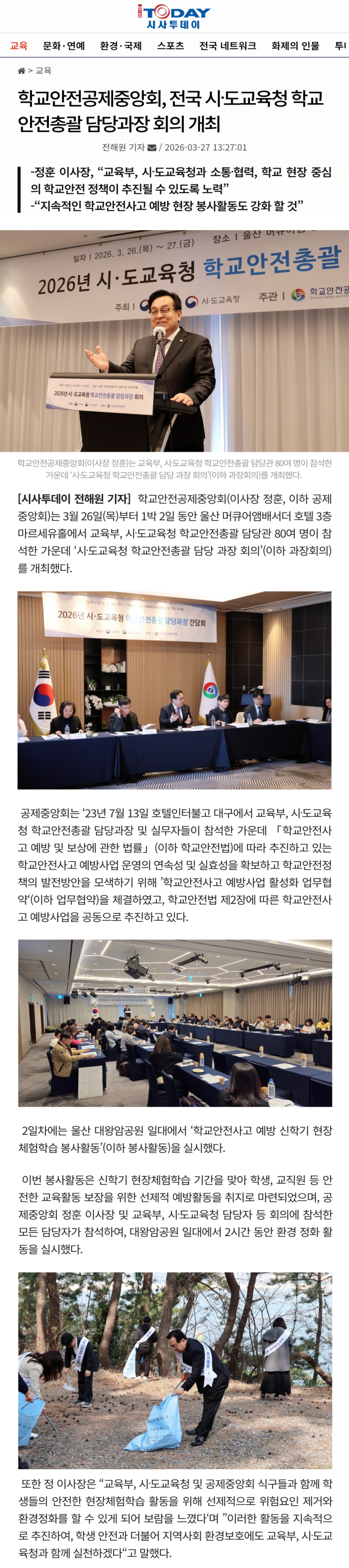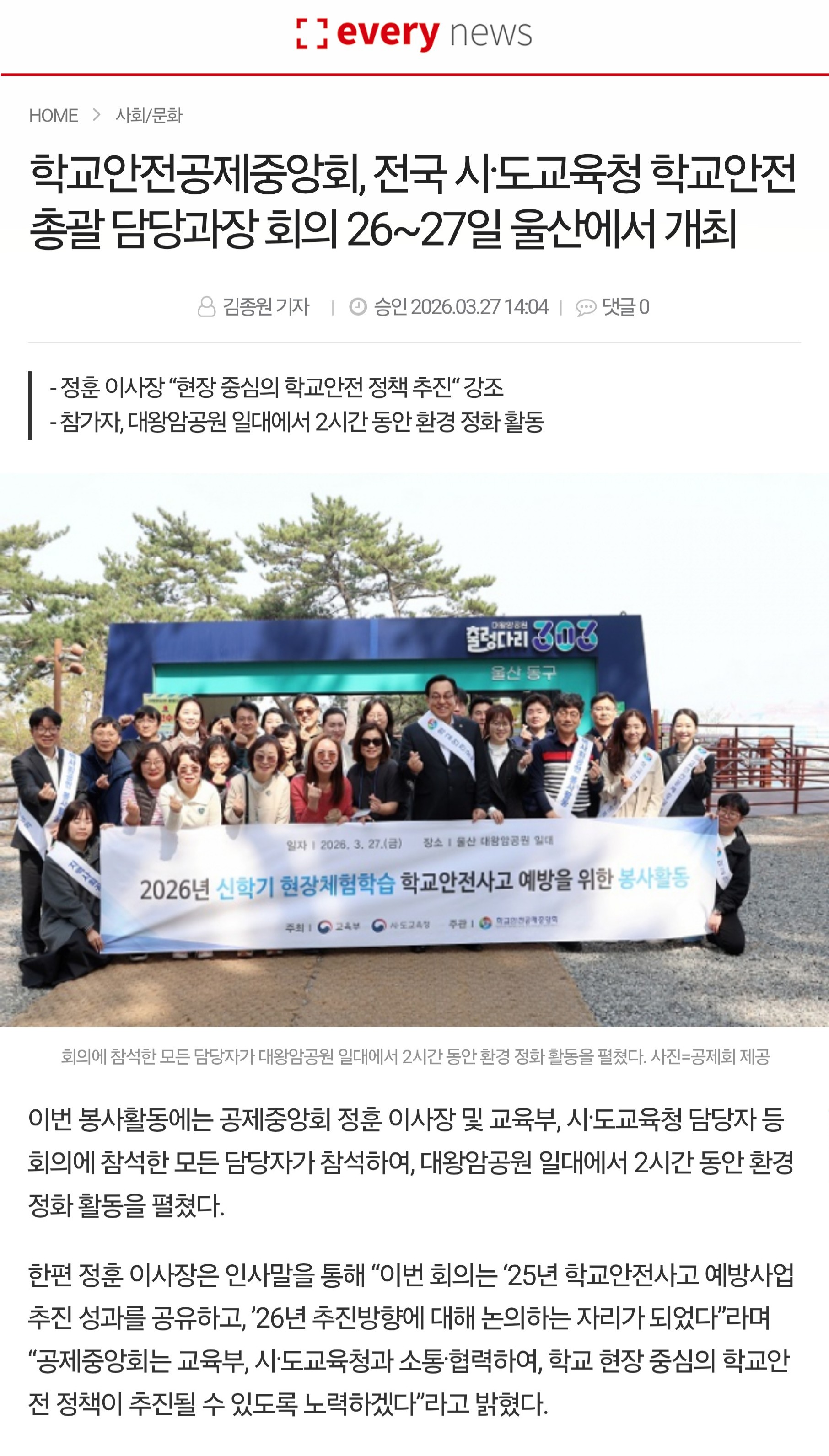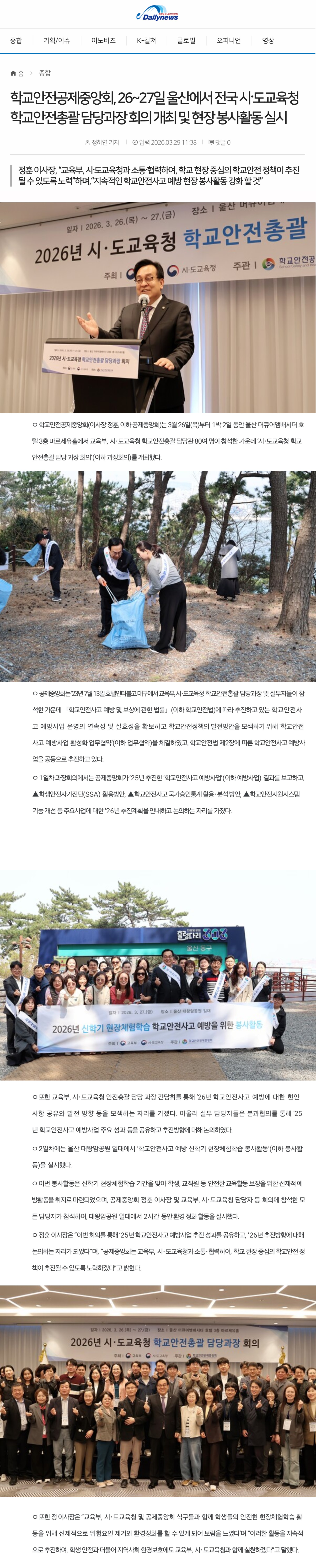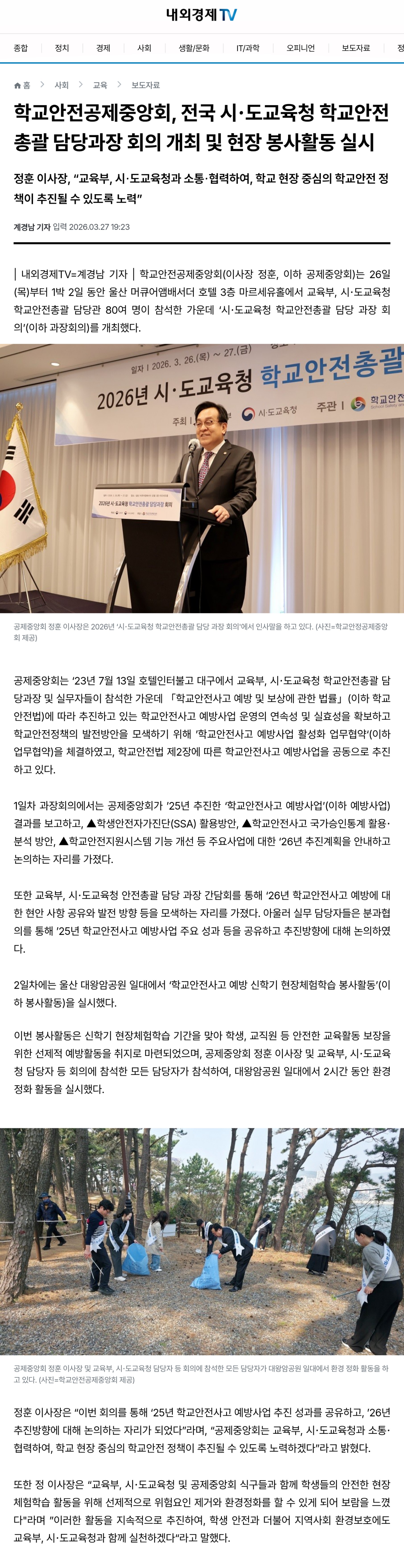 □ [데일리뉴스] (2026.03.29.) 학교안전공제중앙회, 26~27일 울산에서 전국 시⸱도교육청 학교안전총괄 담당과장 회의 개최 및 현장 봉사활동 실시 http://www.idailynews.co.kr/news/articleView.html?idxno=106595