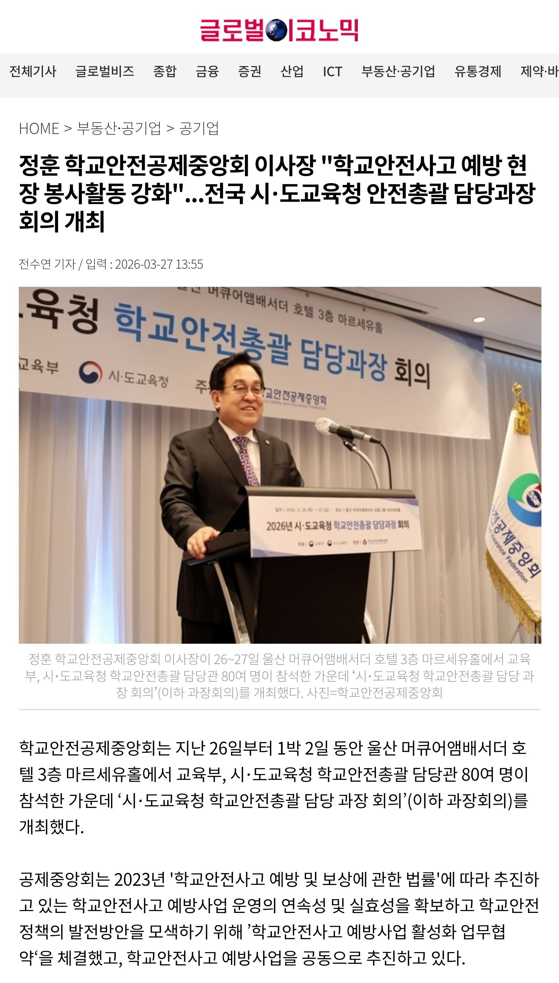 □ [글로벌이코노믹] (2026.03.27.) 정훈 학교안전공제중앙회 이사장 "학교안전사고 예방 현장 봉사활동 강화"...전국 시⸱도교육청 안전총괄 담당과장 회의 개최 https://m.g-enews.com/view.php?ud=202603271353364949a9fc143920_1