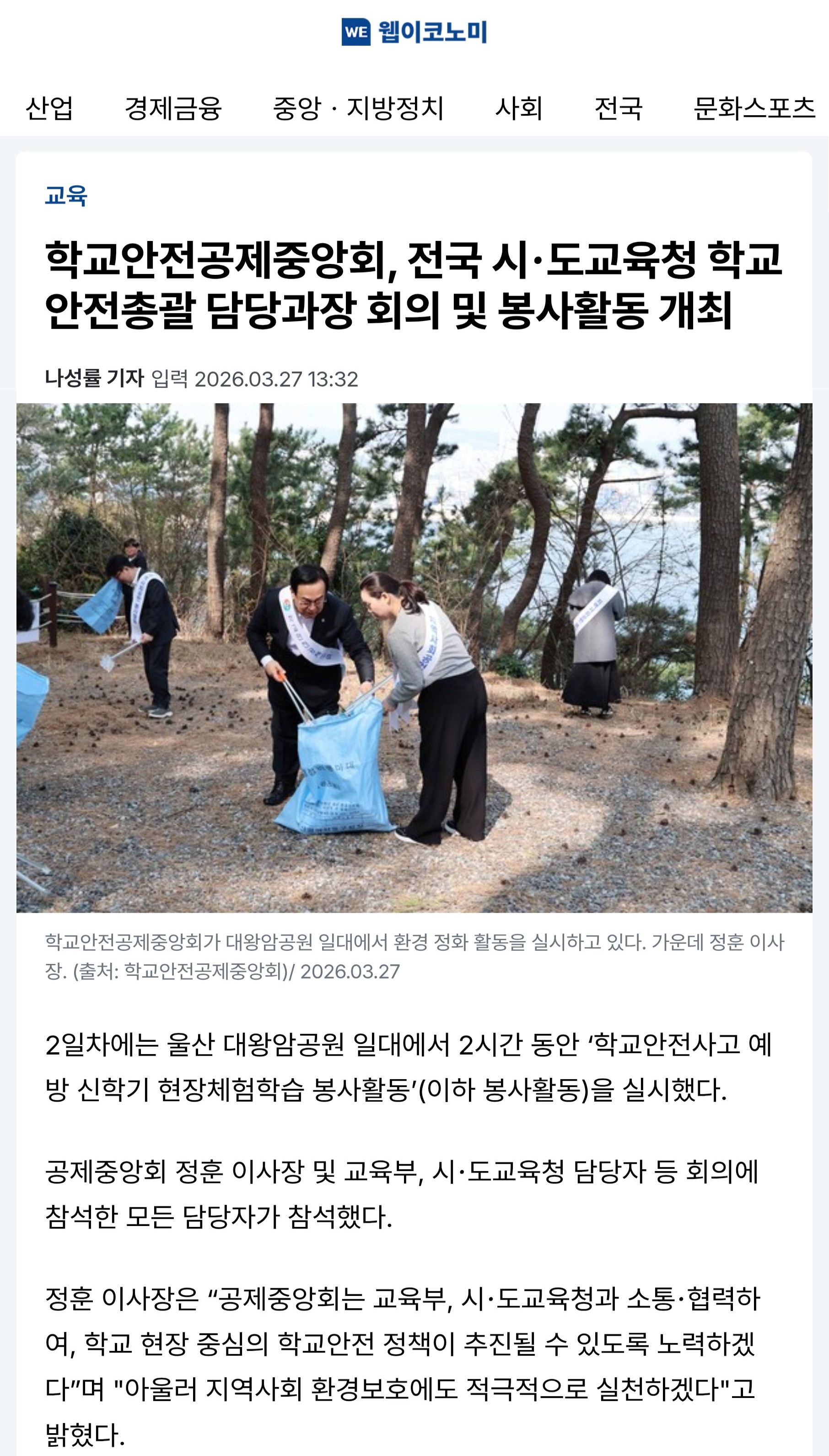 □ [웹이코노미] (2026.03.27.) 학교안전공제중앙회, 전국 시⸱도교육청 학교안전총괄 담당과장 회의 및 봉사활동 개최 https://www.webeconomy.co.kr/news/articleView.html?idxno=2121263