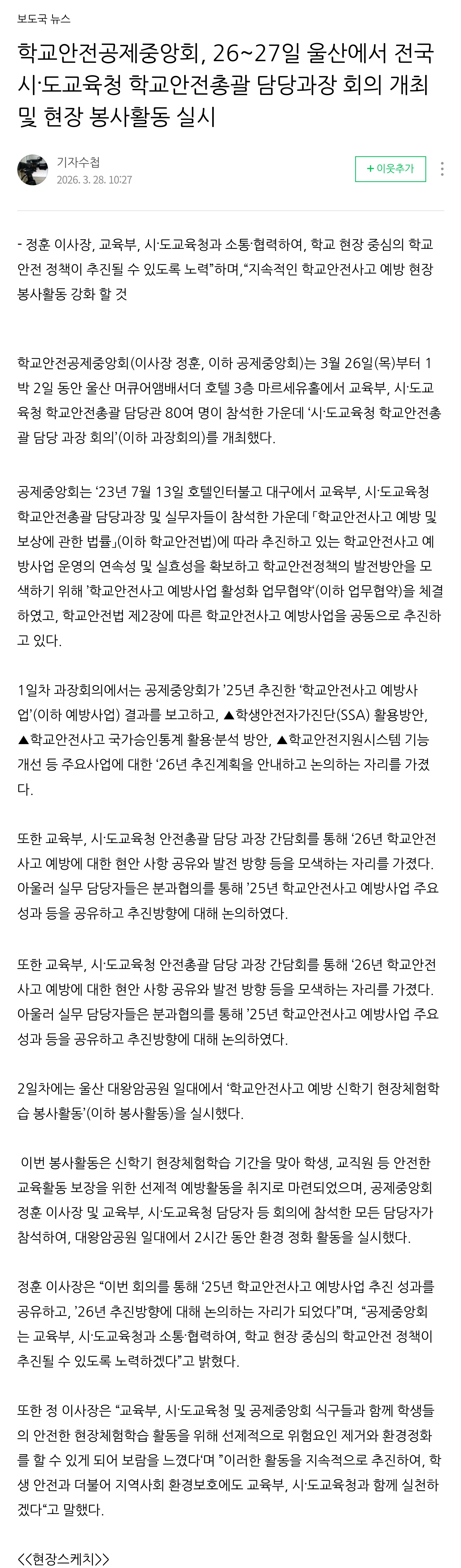 □ [기자수첩] (2026.03.28.) 학교안전공제중앙회, 26~27일 울산에서 전국 시⸱도교육청 학교안전총괄 담당과장 회의 개최 및 현장 봉사활동 실시 https://m.blog.naver.com/enhanok70/224232248823