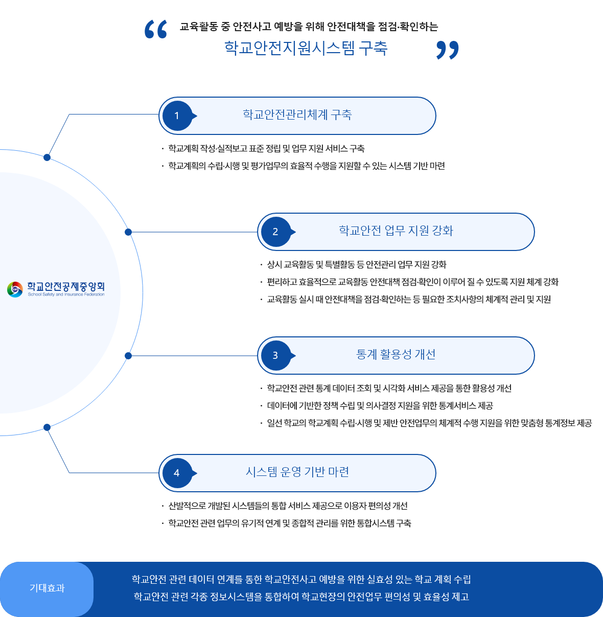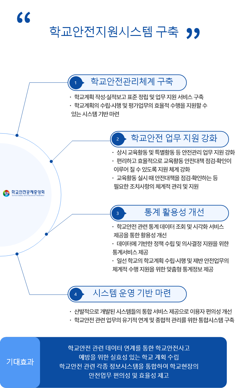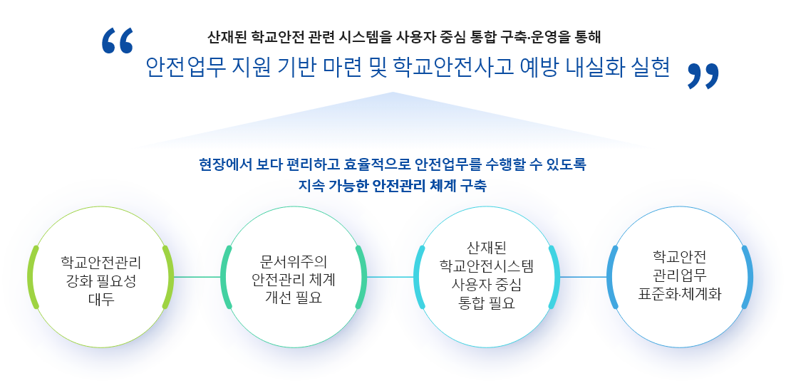 학교안전 예방업무, 사업, 정보를 하나의 전산시스템으로 구축하여 학교, 교육청, 교육부의 안전관리, 안전교육 등 지원