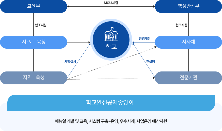 지속적으로 발생하고 있는 등하굣길 교통사고 예방을 위해, 중앙정부, 지자체, 전문기관이 거버넌스를 구축하여 지속적으로 교통환경을 개선 사업